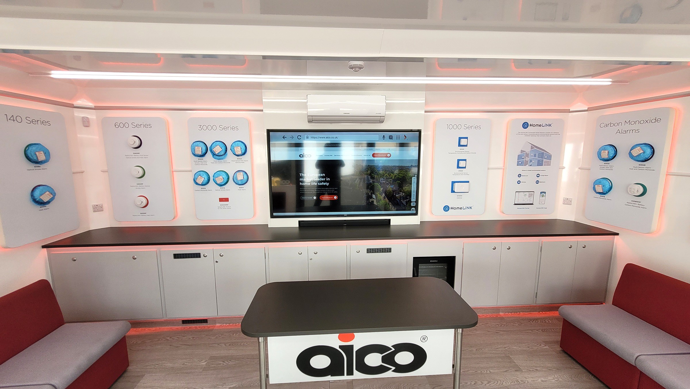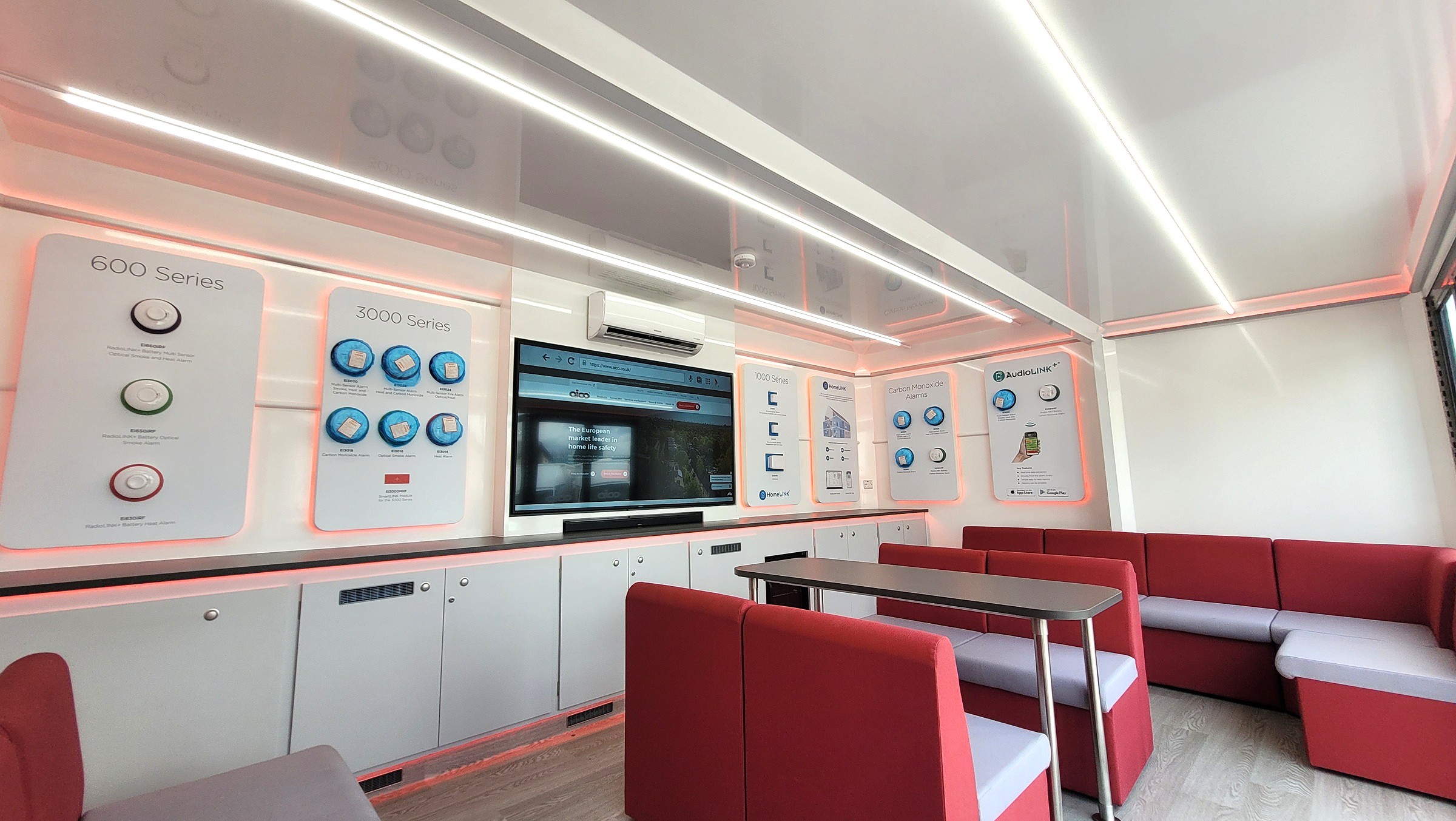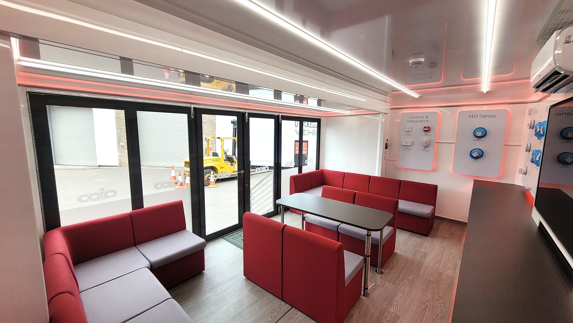 Outside the unit there are two display panels which fold back when deployed to give a good size graphic area and then fold over the pod and windows to protect them during transit. Skirts slide into cader rails around the extension and along the graphic panels. One external feature on the unit is the LED lit Aico sign above the entrance steps which can stay illuminated when on the road if required. The vehicle has a split system air conditioning and heating unit along with four large 48 Volt lithium batteries and a 240 Volt inverter to give an 8 hour run time on an overnight charge, these are linked to two flexible solar panels on the roof to give sustainable power to the inside.