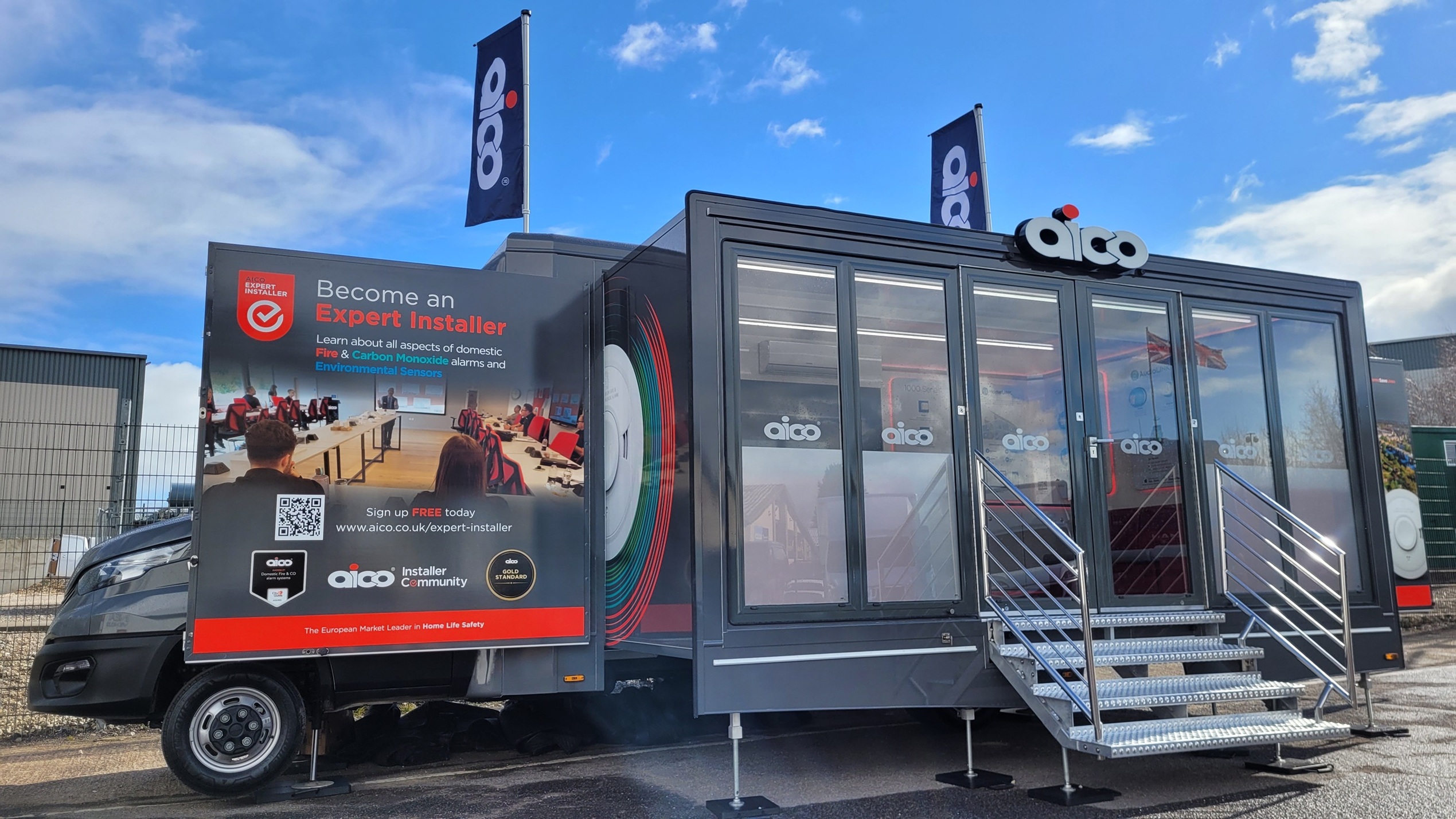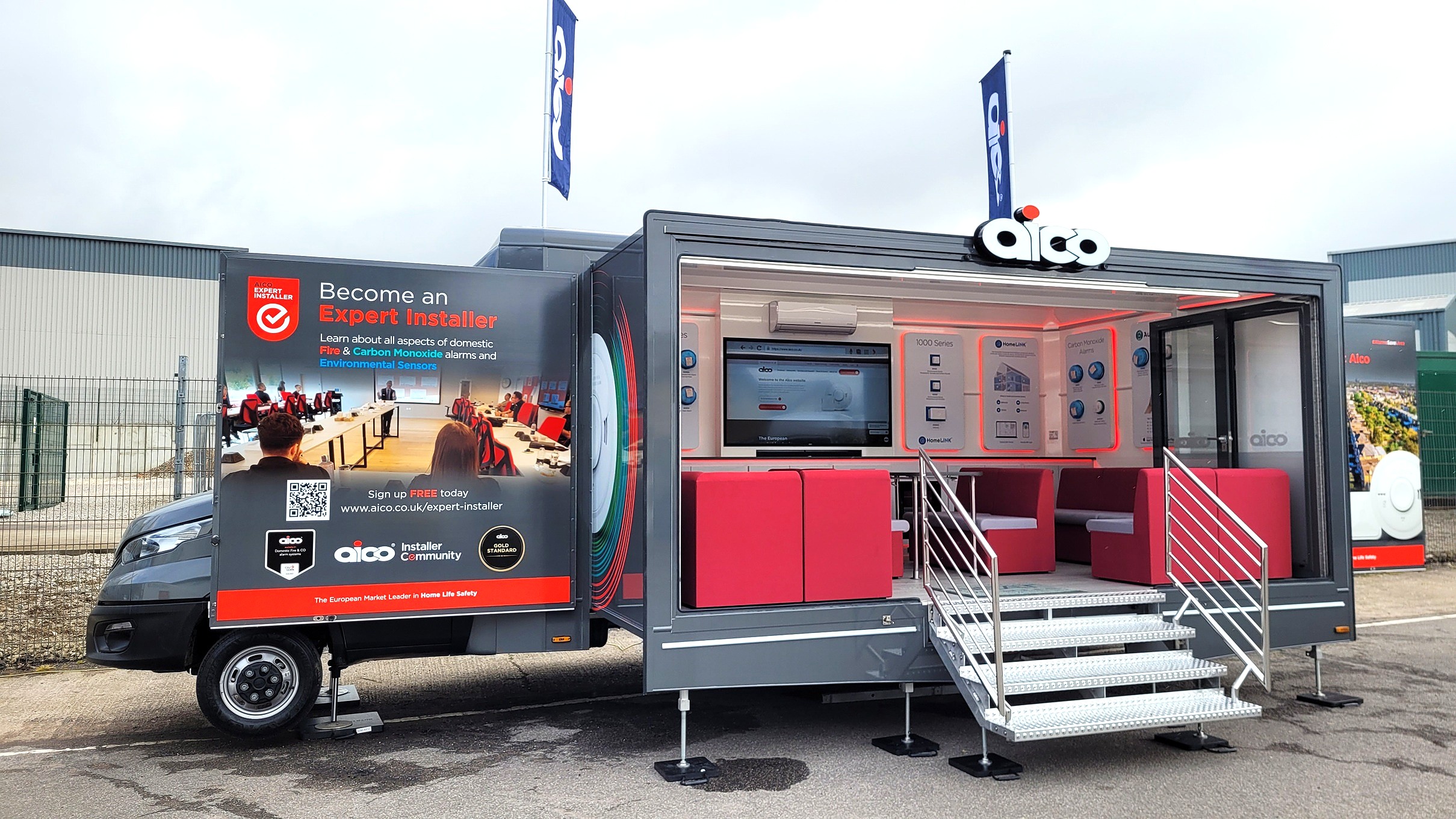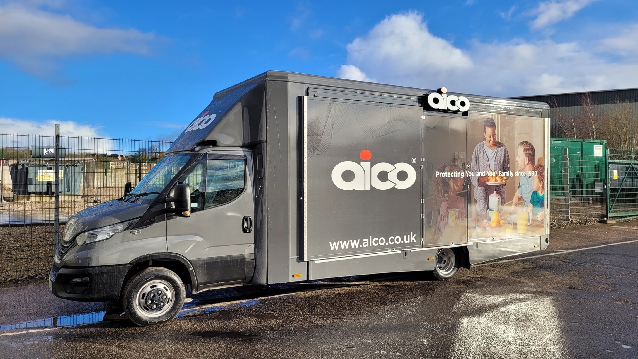 The whole vehicle is wrapped including the pod roof and normal roof with images and logos everywhere so it can be recognised as an Aico unit wherever it goes.