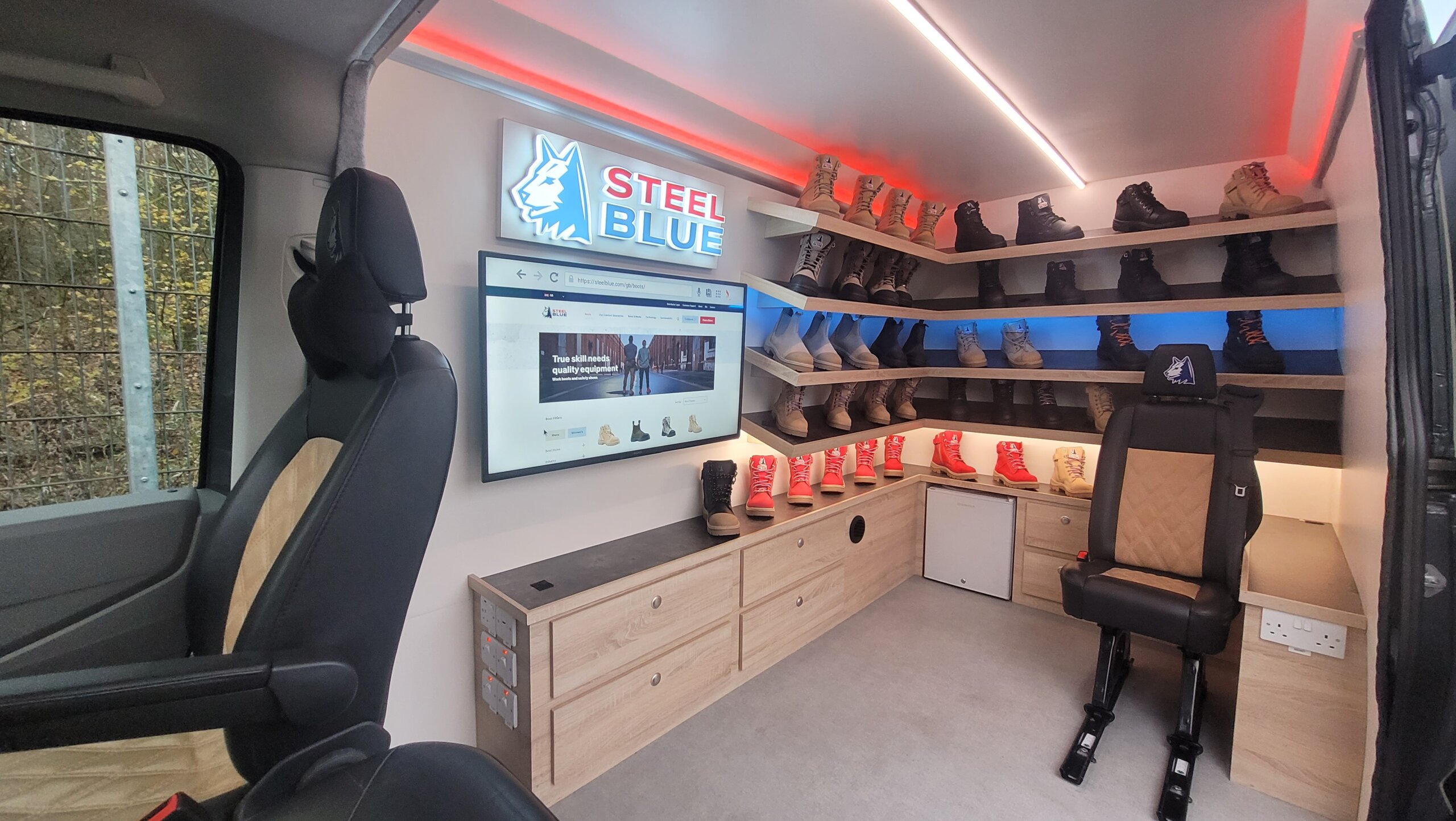 The front sales area has a series of angled shelves to display the boots, a removable sliding chair with custom leather covering, custom built cabinets with integral storage drawers, a TV screen, an illuminated Backlit LED logo, a radio and amp system, a fridge and colourchange LED underlighting and ceiling lighting to give the impression of a small showroom for the company’s products. In the front cab we removed the seats, recovered them all in Steel Blue work boot leather, including the Steel Blue logo on the headrests and made them all spin round to form seating for the showroom area, including the double passenger seat which was the first time we had made one of those spin round.